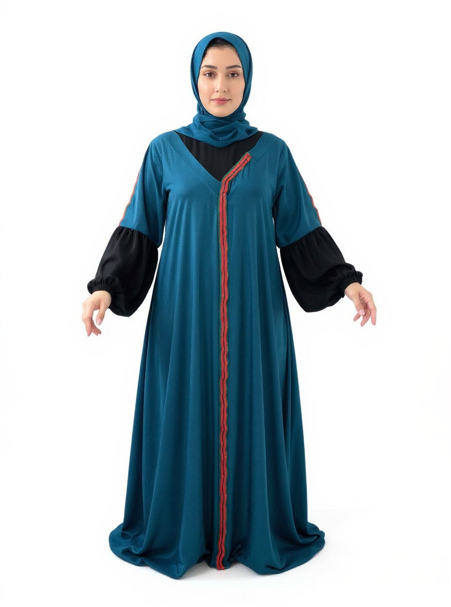 Crafted in a rich teal color with black contrast sleeves and a delicate front trim, it drapes beautifully and offers full coverage without compromising on style.