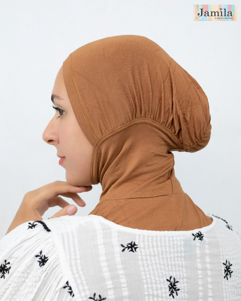 This is a cotton ninja hijab, designed for full coverage and comfort. Made from soft, breathable cotton fabric, it provides a snug yet stretchable fit, ensuring all-day comfort. The design includes a built-in neck cover and extended back coverage, offering a smooth and secure base for layering with any hijab style. The gathered elastic at the back allows for flexibility, accommodating different hair volumes while keeping everything in place. Perfect for daily wear, sports, or under scarves for a polished and seamless look.